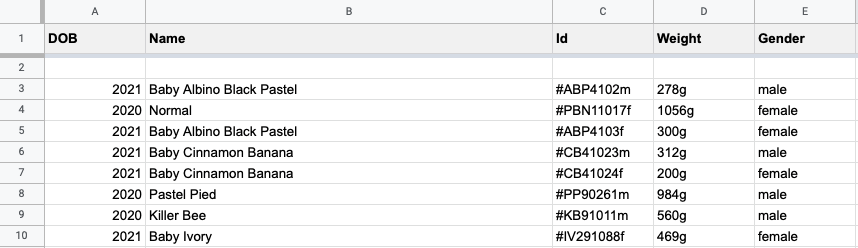 Populate your animals’ information on either the Google Sheet file or Excel file provided below. Information about your animals should be inputted one per line/row on the file like in the example image below.